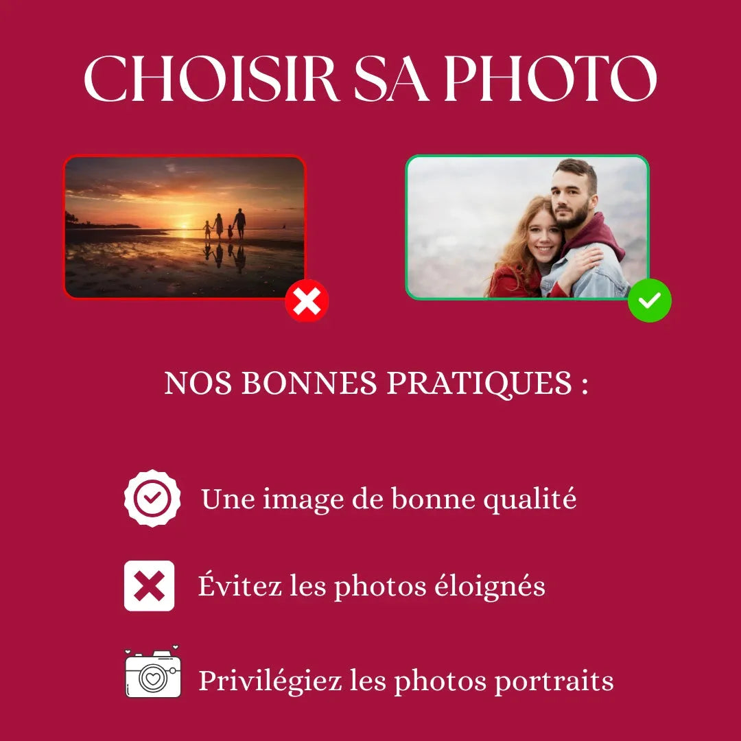 Privilégiez une image nette, bien cadrée, avec un bon contraste (visage/animal). Évitez le flou, le contre-jour et les éléments trop éloignés. 1 à 3 sujets, c’est idéal. Nous ne brodons pas de visuels protégés par droits d’auteur sans autorisation.