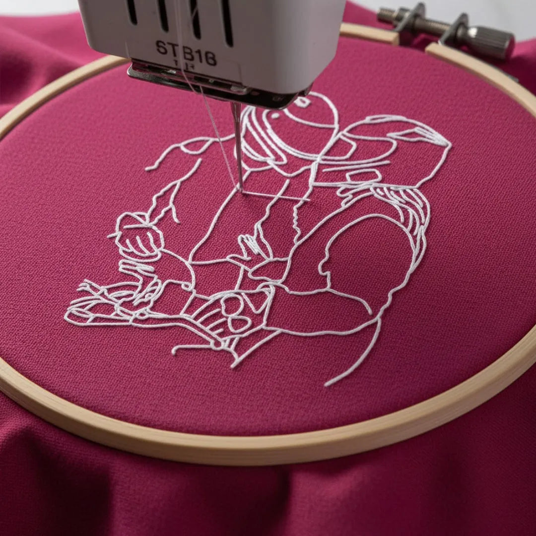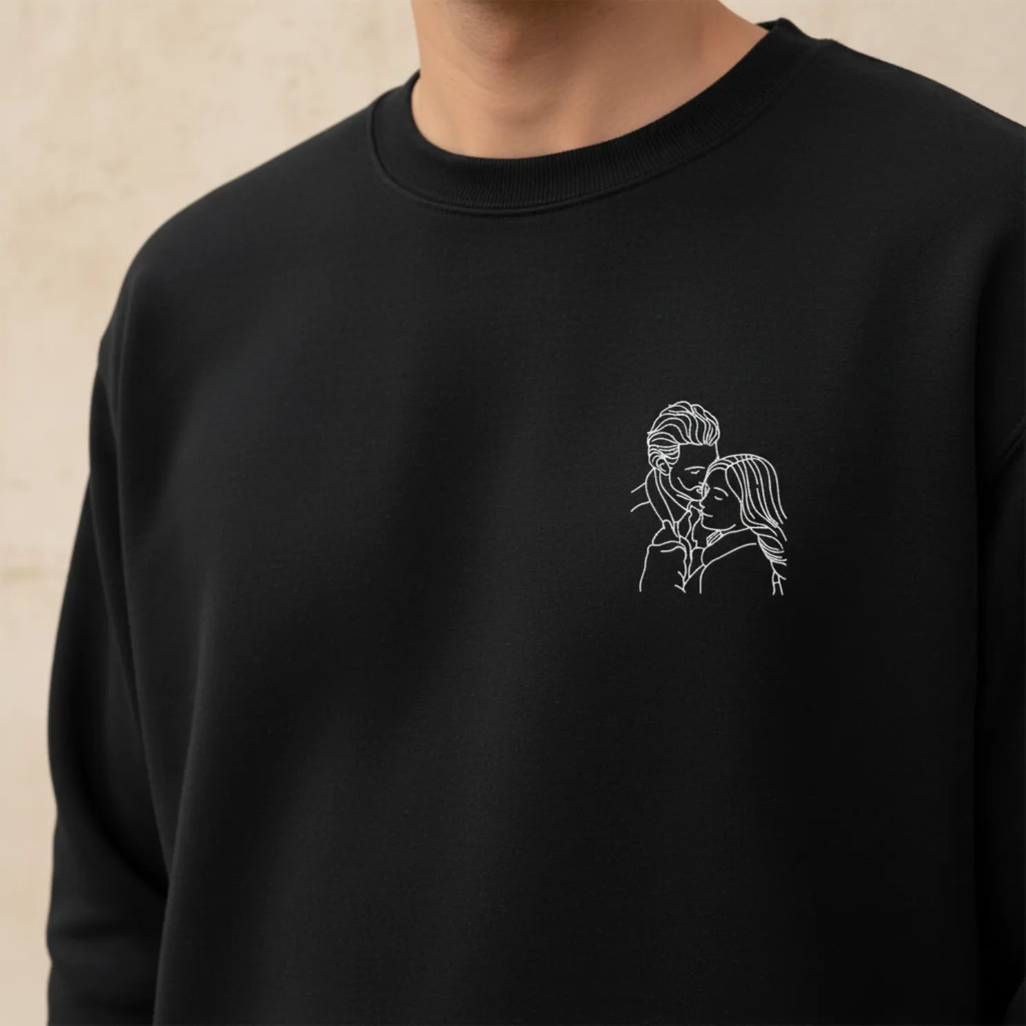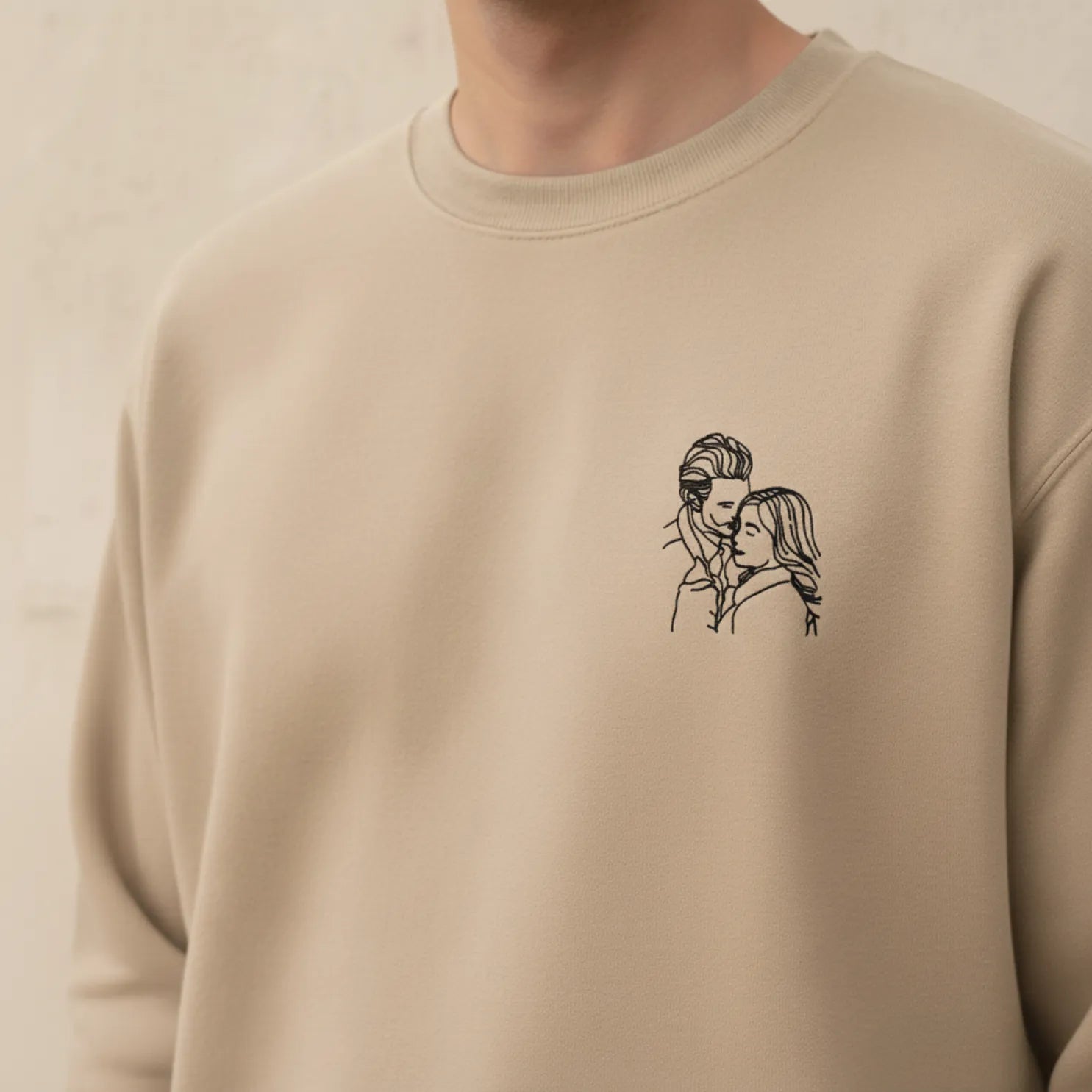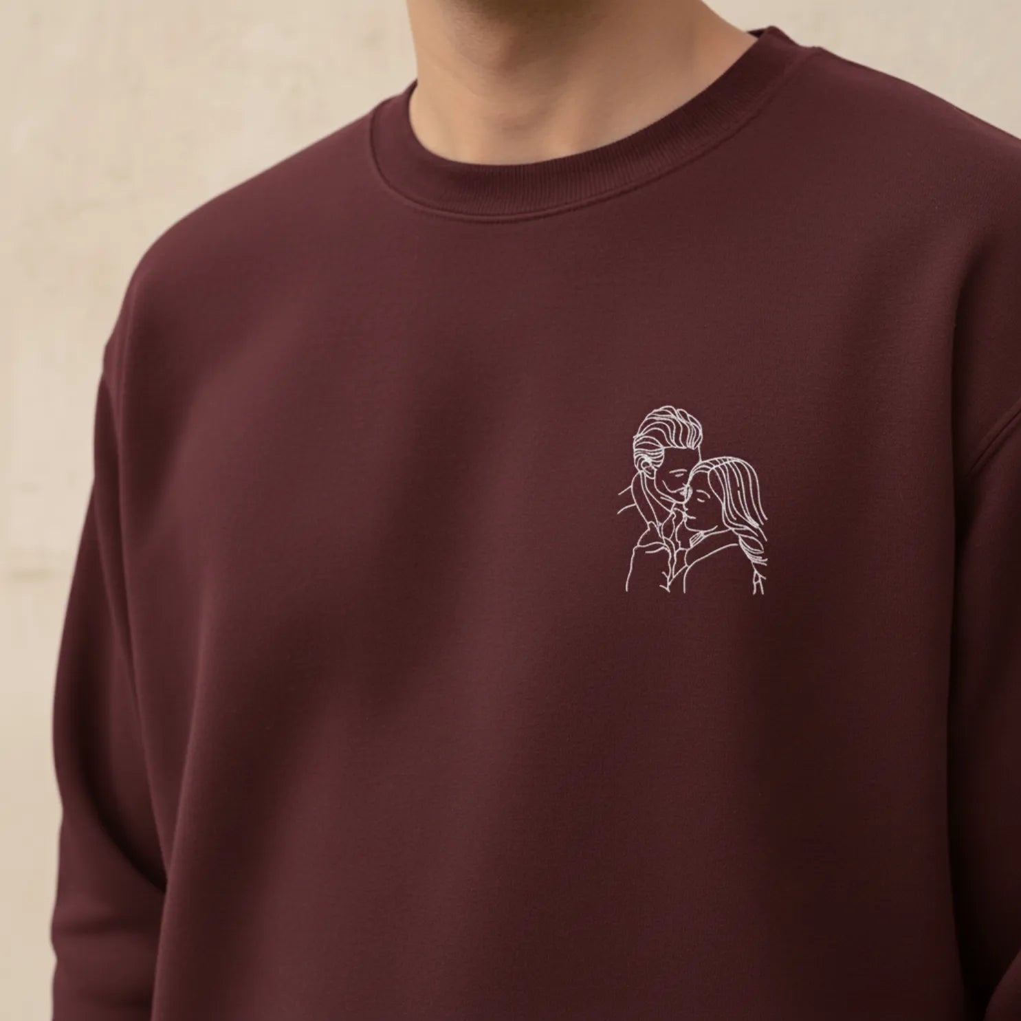 Faites de votre souvenir préféré une pièce unique et stylée 🧵. Téléversez votre photo lors de la commande : nos artistes la transforment en dessin au trait minimaliste, puis nous la brodons avec précision sur un sweat doux et confortable.